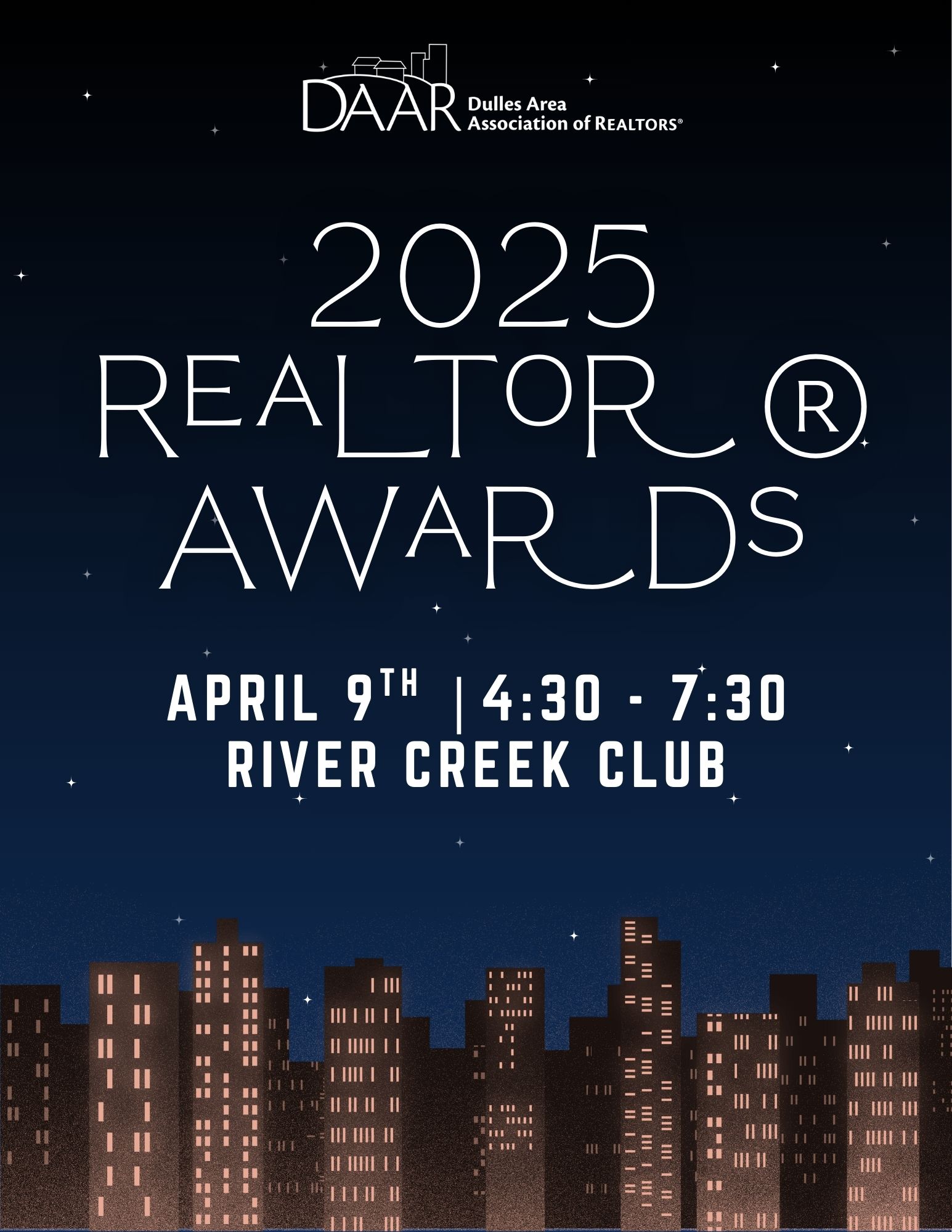 09 Apr 2025 DAAR Awards Ceremony 2025 DAAR Awards Ceremony Thursday, April 9, 2026 (4:30 PM to 7:30 PM) River Creek Club Details You're Registered! DescriptionLocation Celebrate another great year and DAAR's 2025 Award Winners on Thursday, April 9th from 4:30 p.m. to 7:30 p.m. at River Creek Club. Registration includes meal and two drink tickets. Cocktail Hour: 4:30 p.m. - 5:30 p.m. Dinner: 5:30 p.m. Program: 6:00 p.m. - 7:00 p.m. Event Ends: 7:30 p.m. River Creek Club 43800 Olympic Blvd.Leesburg, VA 20176 Map & Directions